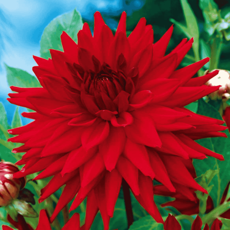 Dalia kaktusowa czerwona to odmiana o niezwykle efektownych, charakterystycznych kwiatach, które przyciągają wzrok swoją finezją i niepowtarzalnym kształtem. Kwiaty są duże i pełne, z wąskimi, szpiczastymi płatkami układającymi się promieniście. Intensywny czerwony kolor płatków nadaje roślinie lekkości i elegancji, a ciemnozielone liście stanowią piękne tło, podkreślając intensywność kwiatów. Roślina kwitnie obficie od lata aż do pierwszych przymrozków i ma mocne, wyprostowane pędy, dzięki, którym kwiaty są stabilne i efektownie się prezentują nawet podczas wietrznej pogody. Świetnie sprawdza się również jako kwiat cięty, wprowadzając do wnętrz romantyczny, delikatny akcent.