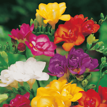 Frezja pełna mix to niezwykle dekoracyjna i aromatyczna roślina cebulowa, która zachwyca zarówno kolorem, jak i intensywnym zapachem. Kwiaty są pełne, wielopłatkowe, tworzące eleganckie, dzwonkowate kwiatostany na cienkich, wzniesionych łodyżkach. W odmianie mix występuje szeroka gama kolorów - od białych, żółtych i kremowych po różowe, czerwone i fioletowe, co sprawia, że kompozycje są niezwykle żywe i urozmaicone. Frezja pełna mix kwitnie obficie wiosną, a jej delikatny, słodki zapach czyni ją doskonałą rośliną do wnętrz i na kwiat cięty. Smukłe liście i wyprostowane pędy nadają lekkości całej kompozycji, a różnorodność kolorów sprawia, że frezje są idealne zarówno do rabat, jak i do bukietów.