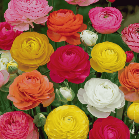 Jaskier mix to efektowna roślina cebulowa o pełnych, kulistych kwiatach w mieszance intensywnych kolorów, która wprowadza do ogrodu wiosenną radość i dekoracyjny akcent. Kwiaty są wielopłatkowe, kuliste, wyrastające pojedynczo na sztywnych łodygach, dzięki czemu tworzą efektowne, kolorowe kompozycje. Mix kolorów obejmuje odcienie czerwieni, różu, żółci, pomarańczu, bieli i fioletu. Jaskier mix kwitnie od wiosny do wczesnego lata i doskonale sprawdza się w rabatach, pojemnikach, ogrodach skalnych oraz jako kwiat cięty.