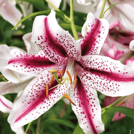 Lilia orientalna Dizzy to niezwykle efektowna i elegancka odmiana, ceniona za duże, pachnące kwiaty o kontrastowym ubarwieniu. Kwiaty są bardzo okazałe, szeroko otwarte, w czysto białym kolorze z intensywnym, różowym pasem biegnącym przez środek każdego płatka. Delikatne cętkowanie i zielonkawy środek dodatkowo podkreślają dekoracyjny charakter kwiatów. Charakterystyczną cechą odmiany Dizzy jest silny, przyjemny zapach, typowy dla lilii orientalnych. Na jednym, mocnym pędzie rozwija się kilka dużych kwiatów, które długo zachowują świeżość. Lilia Dizzy kwitnie w pełni lata i doskonale sprawdza się na rabatach, w nasadzeniach grupowych oraz jako kwiat cięty, wypełniając ogród i wnętrza intensywnym aromatem.