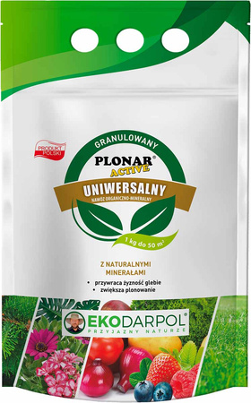 Plonar Active Uniwersalny to granulowany nawóz organiczno-mineralny, który zwiększa żyzność podłoża. Zawiera makro i mikroelementy, a także wysokie stężenie kwasów humusowych. Jeden kilogram Plonar Active skutecznie zastępuje tonę obornika, co czyni go wydajną i ekologiczną alternatywą dla konwencjonalnych nawozów. Może być stosowany do nawożenia, rekultywacji podłoża i poprawy jakości gleby pod różne rodzaje upraw: warzywa, drzewa i krzewy owocowe, rośliny ozdobne, trawniki, iglaki, a także na wszelkie pola uprawne.